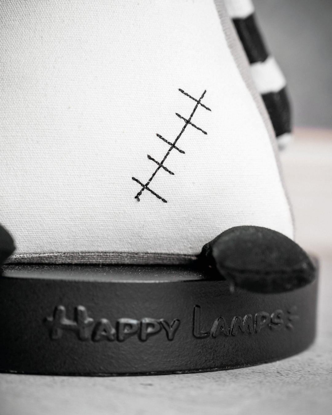 Ben heeft een klein litteken op zijn buik, opgedaan tijdens zijn laatste avontuur, wat hem een uniek karakter geeft. Hij staat stevig op zijn zwarte grondplaat met subtiel “Happy Lamps” reliëf, klaar voor gebruik. Zijn lampenkap zorgt voor zacht, aangenaam licht, terwijl de gestreepte armen en staart zijn coole, speelse look compleet maken.
