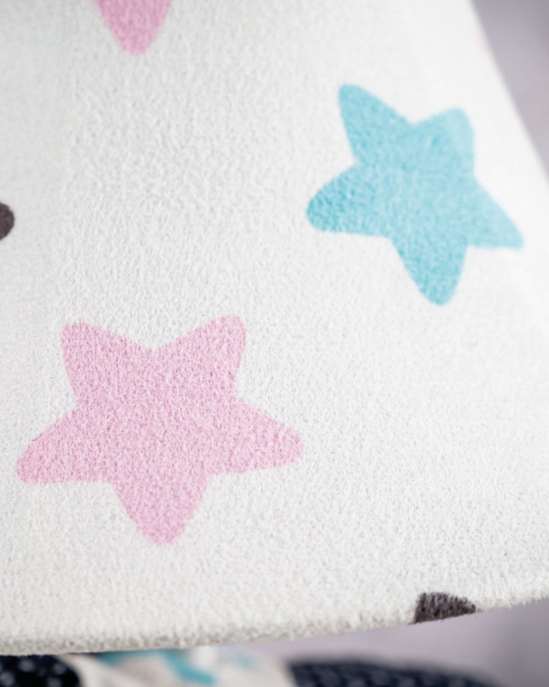 Finn’s lichaam en lampenkap zijn versierd met een speels sterrenpatroon, waardoor hij een betoverende uitstraling heeft. Zijn oren, snuit en manen zijn gedetailleerd afgewerkt in donkerblauw en wit, en zijn lieve lichtblauwe knoopogen geven hem een vrolijke, nieuwsgierige blik. Met zijn unieke design is Finn niet alleen een lamp, maar ook een decoratief pronkstuk.