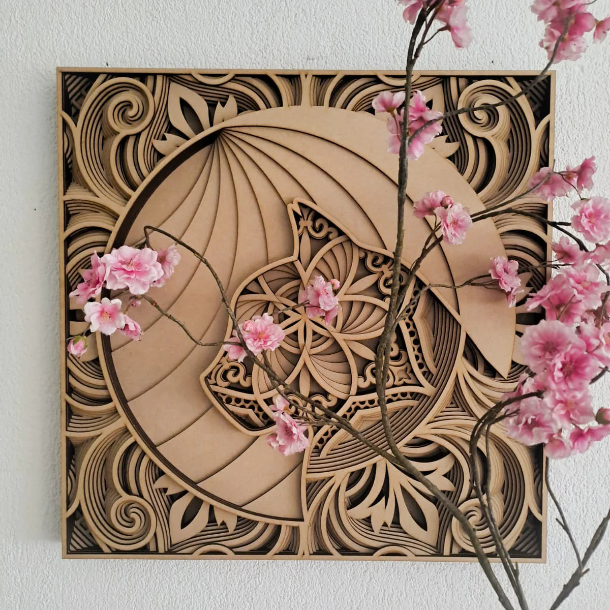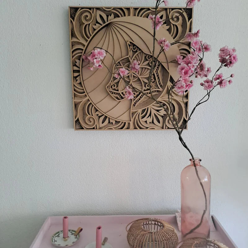 Hang de Kat Mandala eenvoudig in uw woonkamer, slaapkamer. Geniet van de diepte, en de complexiteit van alle vormen deze zorgen voor een Ontspanning en Evenwicht. wij leveren deze gemonteerd en duurzaam verpakt. Het enige wat u hoeft te doen is het ophangen of neerzetten.