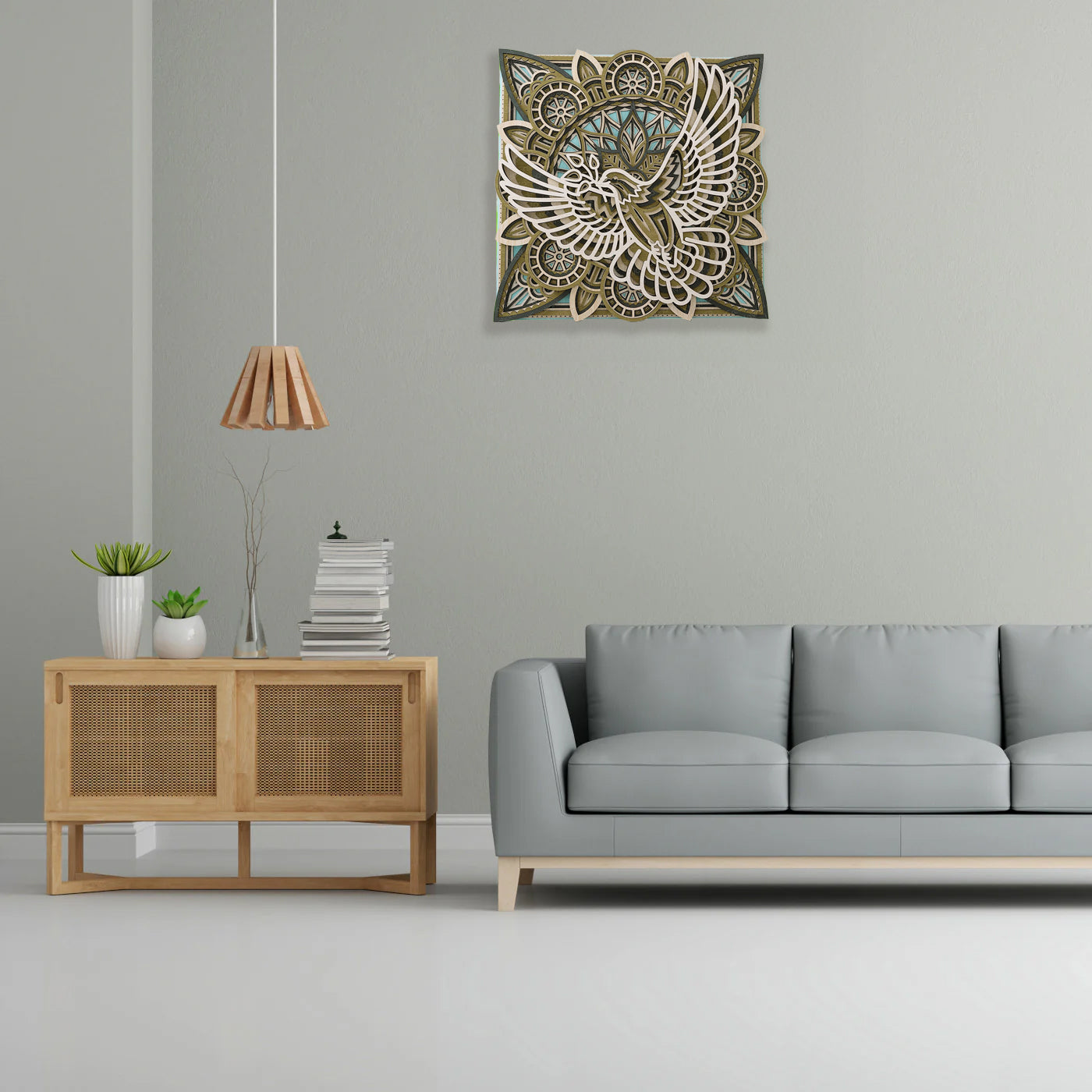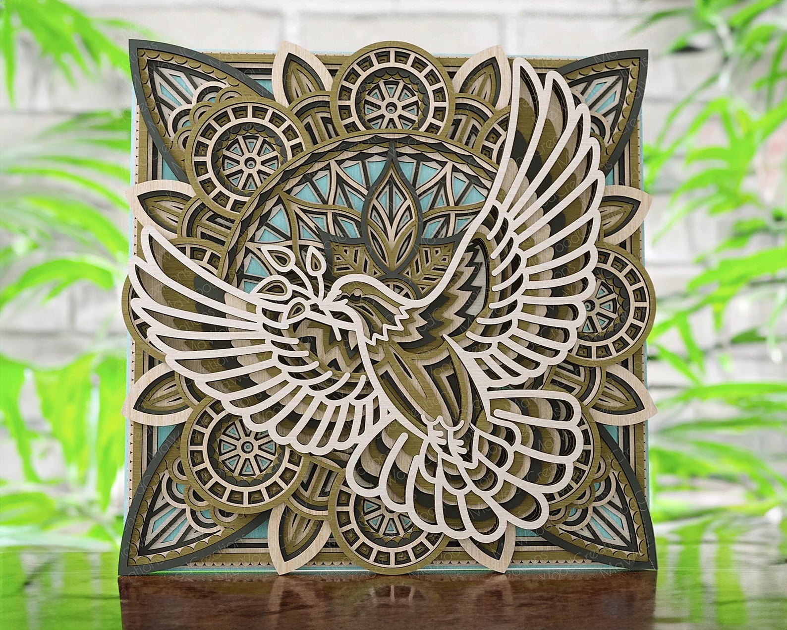 Hang de duif Mandala eenvoudig in uw woonkamer, slaapkamer. Geniet van de diepte, en de complexiteit van alle vormen deze zorgen voor een Ontspanning en Evenwicht. wij leveren deze gemonteerd en duurzaam verpakt. Het enige wat u hoeft te doen is het ophangen of neerzetten.