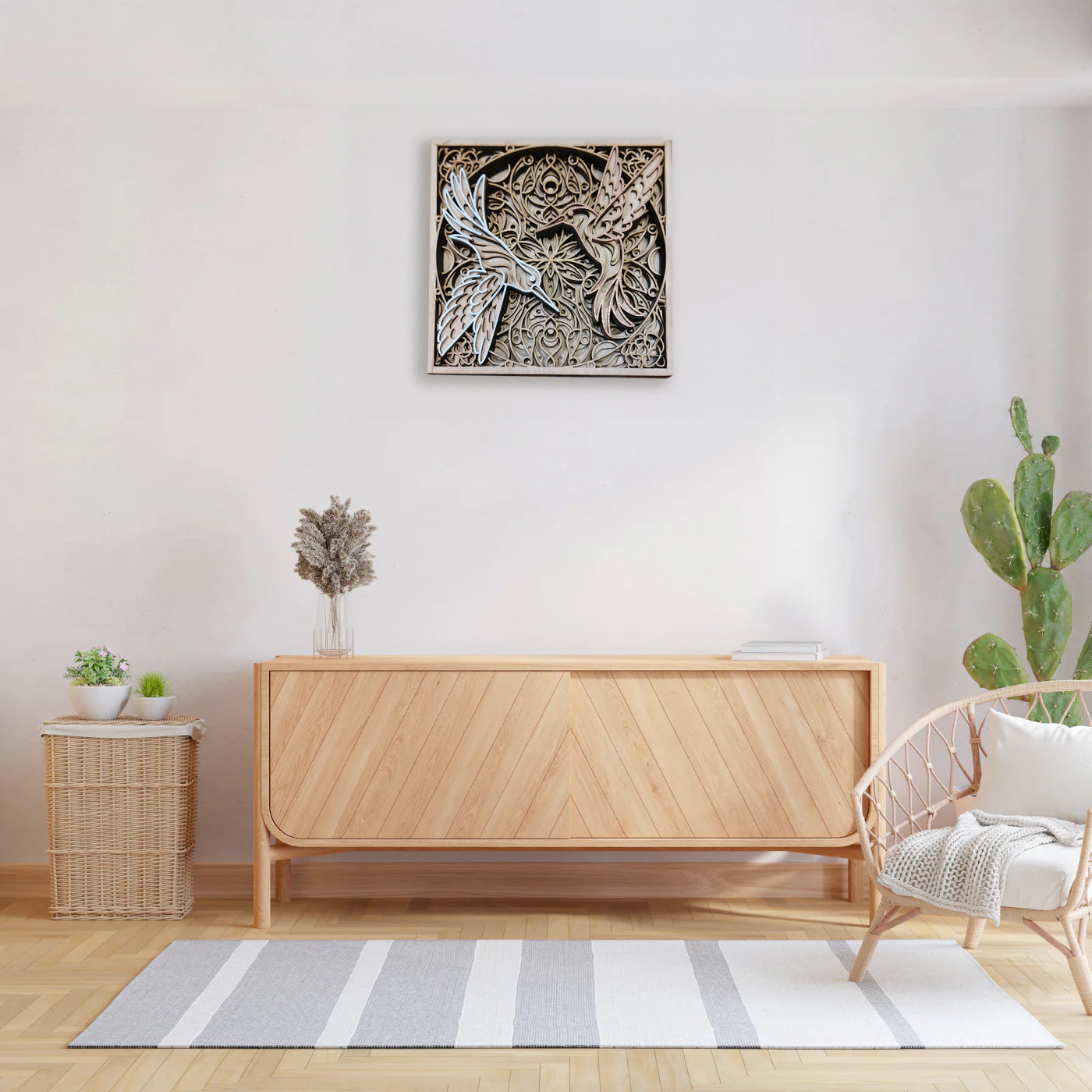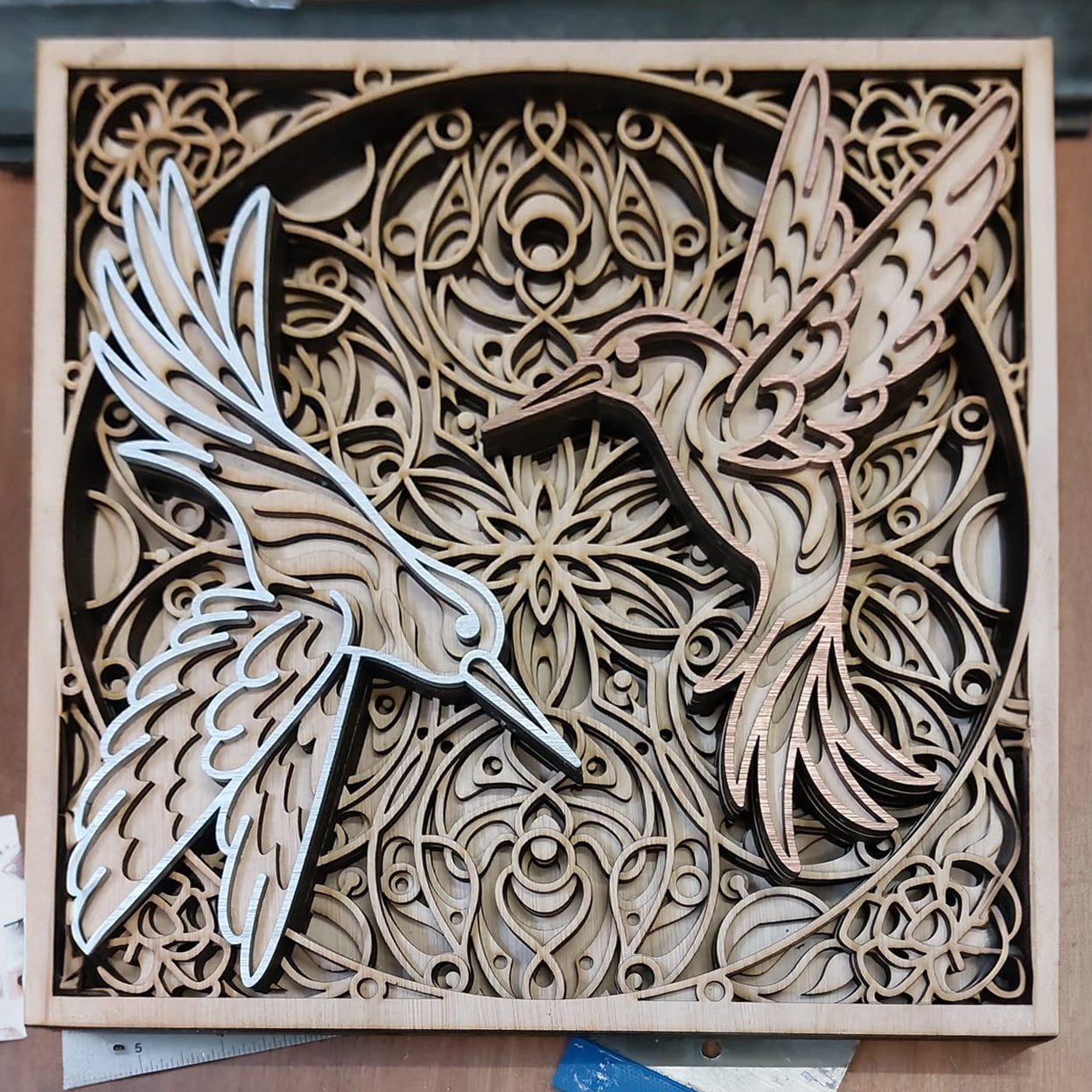 Hang de hummingbirds Mandala eenvoudig in uw woonkamer, slaapkamer. Geniet van de diepte, en de complexiteit van alle vormen deze zorgen voor een Ontspanning en Evenwicht. wij leveren deze gemonteerd en duurzaam verpakt. Het enige wat u hoeft te doen is het ophangen of neerzetten.