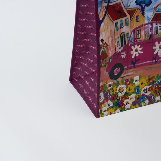 Deze vrolijke tas is meer dan alleen een praktisch item – het is draagbare kunst met een duurzaam hart. De kleurrijke print is gebaseerd op Portchie’s iconische Roze Beetle, een symbool van vrijheid, avontuur en nostalgische charme.